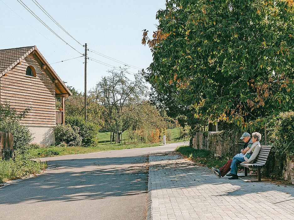 Concrètement, la largeur de la chaussée est réduite pour inciter les usagers à rouler moins vite; bordures et chicanes sont supprimées pour redonner à cet axe son caractère de route de campagne et, sur les bancs récemment posés, les promeneurs peuvent se détendre et laisser leur regard errer sur le paysage alentour. L’ancienne douane est transformée en salle de réunions avec place de pique-nique. D’autres éléments tels que des clôtures, une table en bois avec des bancs en calcaire, un robinet d’eau potable ou la plantation de haies renforcent le caractère rural du paysage tout en protégeant les cultures agricoles. La réalisation d’un premier tronçon de 800 mètres constitue l’étape initiale d’une vision d’ensemble centrée sur une coexistence non conflictuelle entre les habitants, l’agriculture et le paysage.