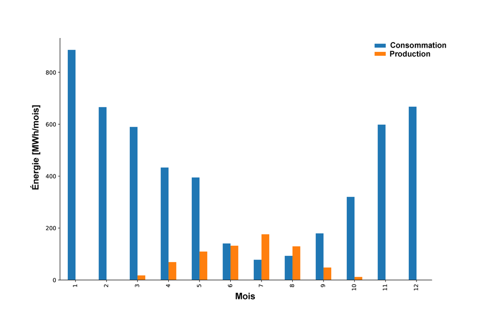 Grâce à leurs outils de simulation, les chercheurs ont conçu une installation solaire thermique dimensionnée de manière à pouvoir couvrir à elle seule les besoins du réseau de chaleur pendant les mois d’été (juillet et août). Il faudrait pour cela une installation de 1800 m² de capteurs et un réservoir d’un volume de 500 m3. Pour pouvoir construire une installation de cette dimension, l’étude propose une surface agricole de 6000 m², car les surfaces de toitures aux Ponts-de-Martel ne suffisent pas pour une installation aussi grande. Une telle installation solaire thermique produirait entre 600 et 800 MWh de chaleur, selon les conditions météorologiques, et pourrait couvrir au moins 10% des besoins annuels. En cas de mauvais temps inhabituel ou si la période sans chauffage au bois doit être prolongée, l’approvisionnement de la clientèle en eau chaude suffisamment chaude peut être assuré en amenant préalablement le réservoir à un niveau de température plus élevé.
