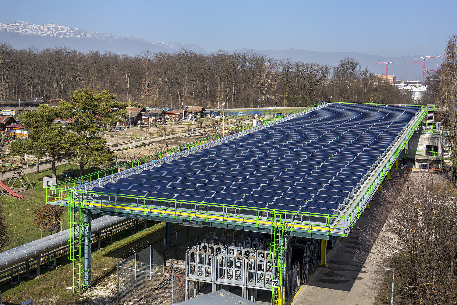 Le réseau de chauffage à distance des Services industriels de Genève (SIG), long de 112 km, alimente environ 62 000 ménages en chauffage et en eau chaude. La chaleur provient de la combustion des ordures ménagères, du bois et, depuis décembre 2020, du soleil. C’est à cette époque que l’installation solaire thermique SolarCAD II, avec 800 m² de capteurs, a été mise en service. La grande installation a été construite sur des piliers au-dessus d’une zone industrielle, laquelle avait déjà été construite dans les années 1980 pour la production de chaleur solaire. Les capteurs collectent environ 540 MWh de chaleur solaire par an et contribuent à environ 0,1% de la quantité fournie au réseau de chaleur genevois.