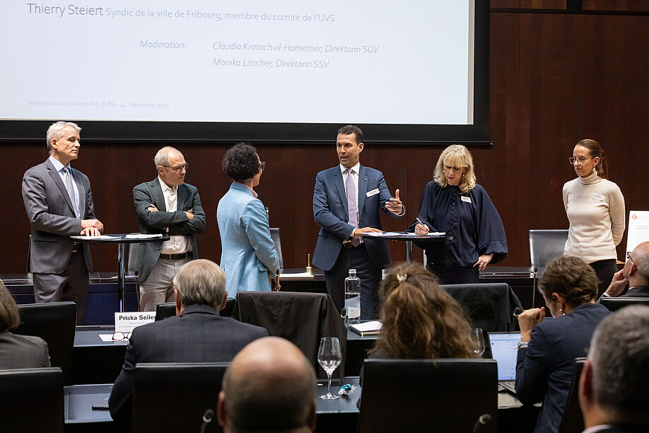Le 24 septembre, l’Association des Communes Suisses (ACS) et l’Union des villes suisses (UVS) ont remis la déclaration «Les villes et les communes dans l’Etat fédéral» au conseiller fédéral Beat Jans, au Palais fédéral. Cette déclaration s’inscrit dans le cadre du 25e anniversaire de l’article 50 de la Constitution fédérale, qui oblige la Confédération à tenir compte des conséquences éventuelles de son activité pour les communes. Une table ronde a permis d’aborder les défis actuels, tels que la motion Schilliger, qui vise à interdire le principe des limitations de vitesse à 30 km/h sur les routes à l’intérieur des localités, ou encore le programme d’économies de la Confédération, qui touche également les villes et les communes. Le conseiller fédéral Beat Jans s’est prononcé en faveur d’une collaboration étroite entre les différents niveaux étatiques et a souligné l’importance de l’autonomie et de l’innovation communales. Le président de l’ACS, le conseiller aux Etats Mathias Zopfi, a demandé que les villes et les communes soient impliquées dès le début dans les processus législatifs afin de préserver leurs intérêts.