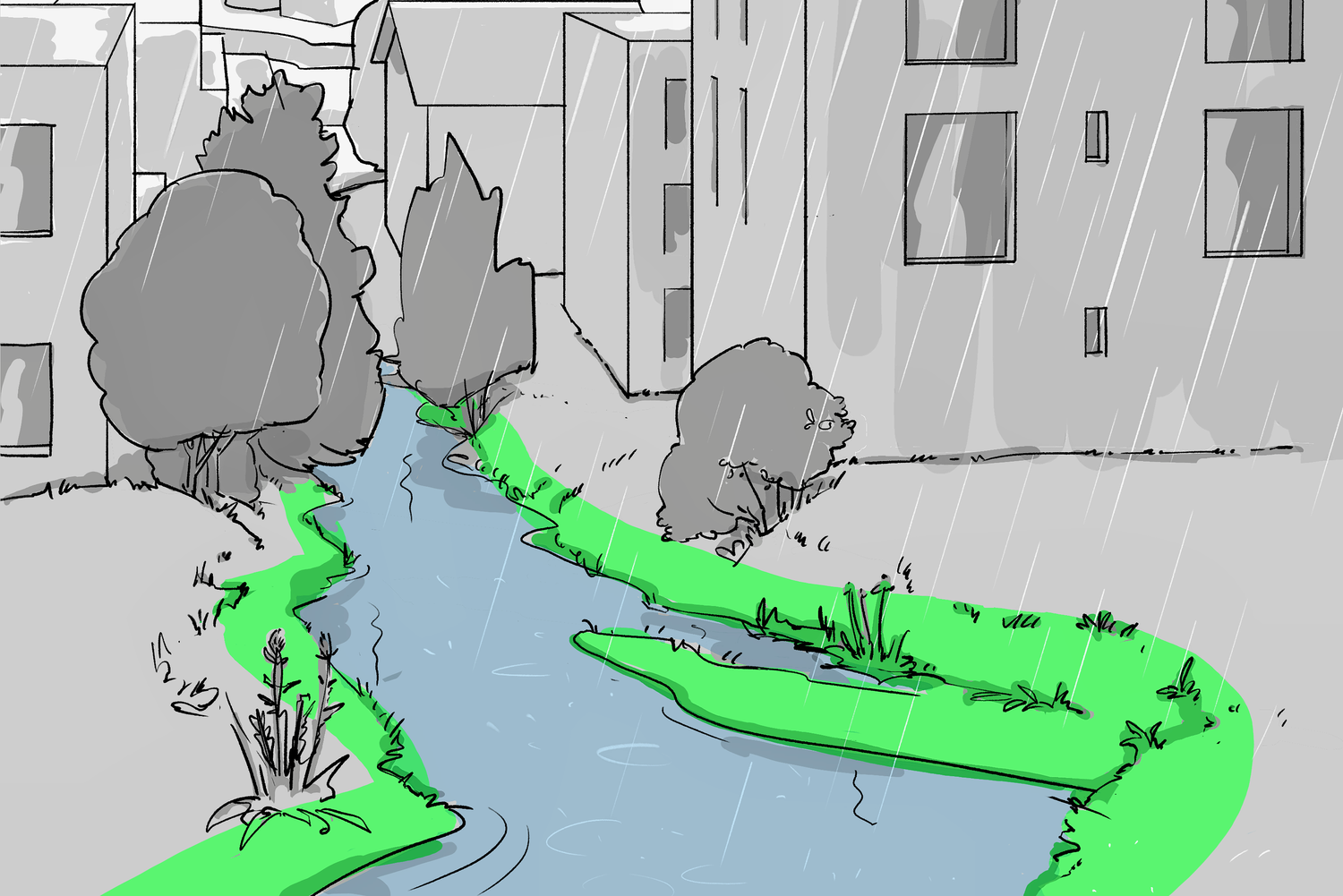 Selon les scénarios climatiques pour la Suisse CH2018, il faut s’attendre à une nette augmentation de la fréquence et de l’intensité des fortes pluies, dont les conséquences sont aggravées par l’imperméabilisation des sols et la densification de l’habitat. L’eau de pluie qui ne s’infiltre pas directement s’écoule sur le sol sous forme de ce que l’on nomme le ruissellement de surface. Quelques centimètres d’eau à un endroit critique suffisent à inonder un sous-sol.