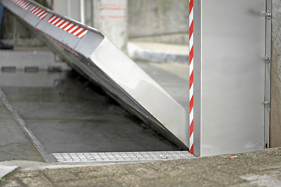 Les mesures de protection constructives sont souvent faciles à mettre en œuvre. Des mesures de protection contre les crues bien intégrées dans le contexte architectural (p. ex. surélévation des ouvertures et des accès) sont esthétiques et protègent de manière fiable. S’il n’est pas possible de mettre en place des mesures de protection constructives permanentes pour préserver les entrées des parkings souterrains, des dispositifs techniques qui ne nécessitent pas d’intervention humaine peuvent être installés, par exemple une barrière qui se relève automatiquement en cas d’inondation. Une barrière rabattable se compose essentiellement d’un réservoir enterré et d’une cloison mécanique. Lorsque l’eau entre dans le réservoir, la barrière se redresse sous son action. Car, en cas d’urgence, il n’y a généralement pas assez de temps pour installer des batardeaux et des sacs de sable. Dans le cadre de la protection contre les crues, la norme SIA 261/1 impose même une solution permanente.