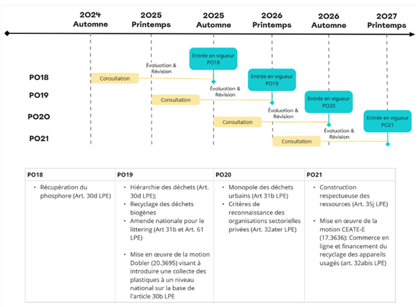 La plupart des modifications législatives liées à l’initiative parlementaire 20.433 «Développer l’économie circulaire en Suisse» sont entrées en vigueur le 1er janvier 2025. La révision avait comme objectif de renforcer l’approche de l’économie circulaire notamment par l’écoconception, l’amélioration de la préparation en vue de la réutilisation et la préservation des ressources dans le secteur de la construction. D’autres dispositions plus organisationnelles comme l’assouplissement du monopole des déchets urbains et la reconnaissance d’associations de branche privées pour le financement de l’élimination de certains déchets ont également été introduites.