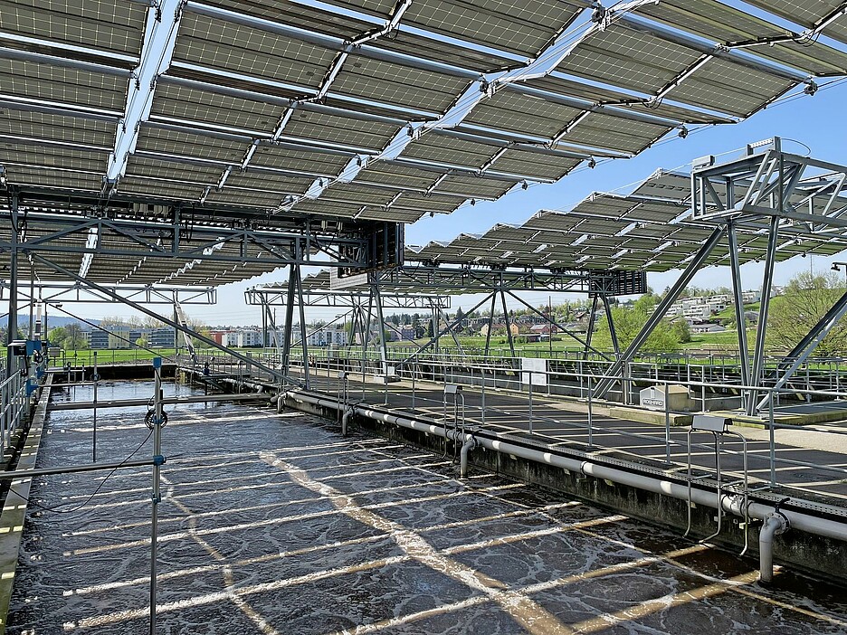 Les stations d’épuration assainissent les eaux usées afin de réduire autant que possible le rejet de substances nocives dans les cours d’eau. Cela exige plusieurs étapes de traitement et beaucoup d’électricité. La STEP de Bassersdorf (ZH) produit elle-même environ 70% de ses besoins en électricité. 1024 panneaux solaires recouvrent à une hauteur de 4 mètres les bassins en béton destinés au traitement biologique des eaux usées. En cas de risque de grêle, de neige ou de vent violent, les panneaux fixés sur des câbles en acier sont rétractés et repliés mécaniquement. Le toit solaire pliable avec une production annuelle de 330 000 kilowattheures (kWh) a été complété en 2023 par une centrale de cogénération entièrement nouvelle. Elle fonctionne grâce à du méthane provenant de la digestion des boues d’épuration et fournit de l’électricité à hauteur de 380 000 kWh par an.