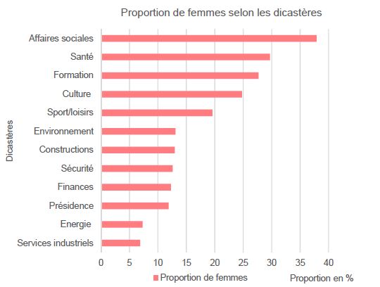Les conseillères municipales sont notamment en charge du dicastère des affaires sociales (38%), suivi par ceux de la santé (30%) et de la formation (28%). Elles sont en revanche peu présentes à la tête des services industriels, ce qui reflète une répartition classique des rôles. En ce qui concerne le style de direction au sein d’une commune, les femmes semblent agir avec plus de circonspection que les hommes. Parmi les facteurs pouvant contribuer à une mise en oeuvre réussie d’un projet, les femmes jugent qu’une clarification préalable précise (91,3%) et une planification détaillée des étapes (73,7%) sont particulièrement pertinentes. Chez les hommes, ces parts sont respectivement de 85,3% et 62,4%. Les femmes comme les hommes semblent toutefois convaincues que l’engagement des exécutifs est central pour faire aboutir des projets (femmes: 80,5%, hommes: 74,2%), tout comme une bonne situation financière (femmes: 72,4%, hommes: 65,4%) ainsi que l’engagement de l’administration communale (femmes: 72,2%, hommes: 65,5%).