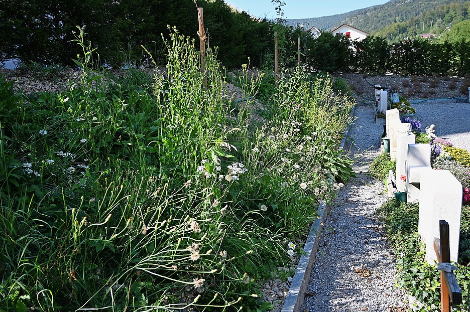 Le thème de la biodiversité est également abordé à l’école de Mümliswil-Ramiswil. Le site de l’école Rank se transforme en un lieu d’apprentissage et de vie pour le développement durable. Les élèves ont participé activement à la planification et ont apporté leurs idées pour promouvoir la nature. Ces idées ont pu être concrétisées en collaboration avec des volontaires du village: un jardin d’herbes aromatiques, des haies et des cabanes en osier ont ainsi vu le jour. Le cimetière du village bénéficie lui aussi d’un aménagement proche de la nature: le projet consiste à remplacer les arbustes d’ornement exotiques par des espèces indigènes et à transformer les pelouses en prairies fleuries.