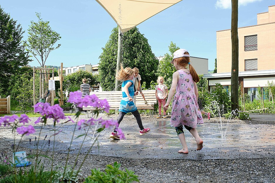 Les enfants peuvent découvrir ensemble de nombreuses possibilités de grimper, se balancer et glisser. Des sièges permettent de se reposer. Divers arbres et buissons offrent de l’ombre en été mais aussi des cachettes aux enfants. Le jeu d’eau est un des attraits principaux. Les enfants peuvent retenir l’eau, la laisser couler à travers des canaux ou la pomper avec un levier. L’eau circule d’avril à la mi-octobre et est arrêtée pendant la saison froide. «Les parents qui connaissent bien la place de jeux emmènent la plupart du temps des habits de rechange car ils savent que les enfants seront mouillés», précise Wisi Kathriner, en souriant.