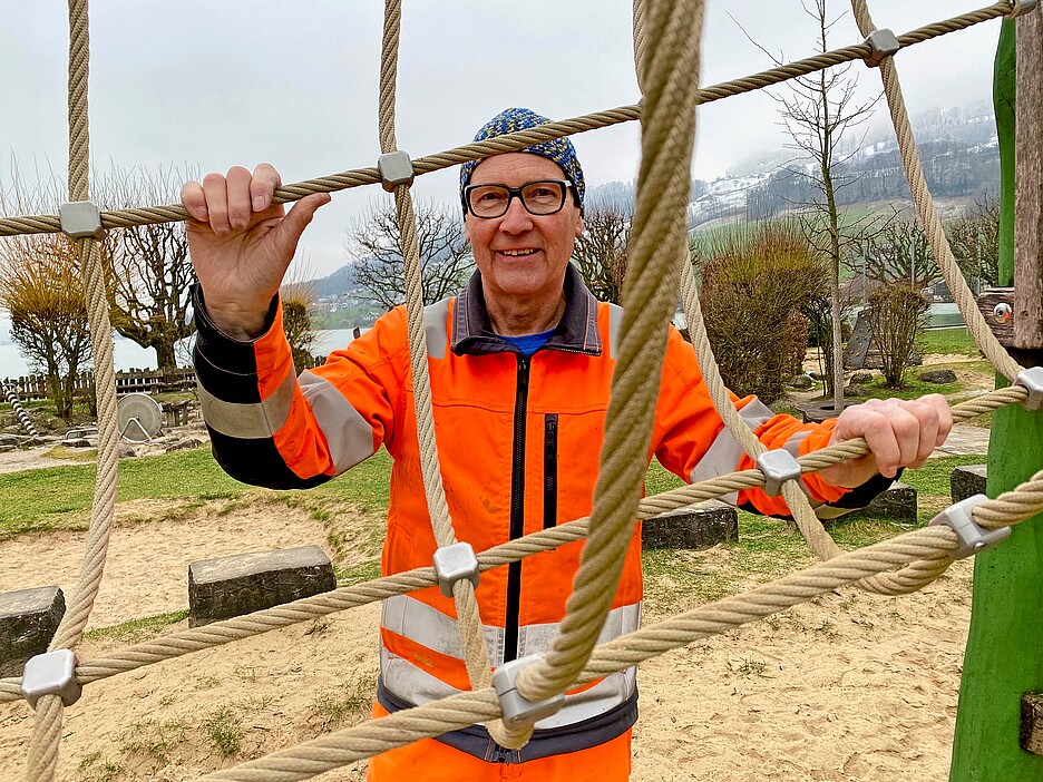 Un brouillard épais plane sur le lac de Sarnen, le froid est mordant en ce jour d’hiver. Mais cela n’a pas dissuadé deux familles de se rendre sur la place de jeux «Kapitän Zinsli» à Sarnen (OW), directement au bord du lac. Bien emmitouflés, deux petits enfants ramassent consciencieusement du sable avec une pelle pour le verser sur une installation de jeu en bois. Un peu à l’écart, dans sa combinaison orange, Wisi Kathriner assiste à la scène et sourit. L’activité des enfants va lui donner du travail plus tard. Deux fois par semaine, ce responsable de l’équipe des espaces verts du Service d’exploitation de la commune de Sarnen consacre quelques heures à l’entretien du terrain de jeux. Il remplit les trous que les enfants ont creusés dans le sable, taille les buissons, tond la pelouse pendant la belle saison et contrôle régulièrement l’ensemble de l’infrastructure.
